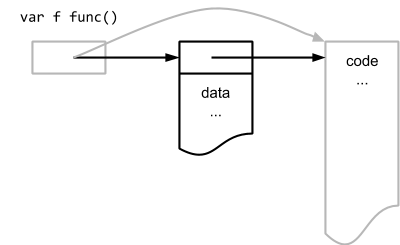 实际上,Go 分配了一个额外的对象,其第一个字段是一个指向我们真实函数的指针,第二个对象是与函数强相关的一些数据(对,没错,说的就是接收者 receiver)。于是,一次函数调用实际上会生成类似如下的代码: